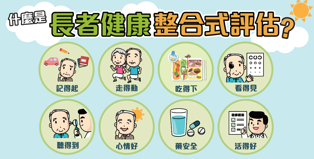 維護家中長者身體健康,不只是關心慢性疾病控制的情形,更需要留意身體與心理功能!國民健康署參考國際文獻,將抗老最核心的八個面向「認知功能、行動能力、營養、聽力、視力、憂鬱情形、用藥及生活目標」,整合為一套簡要的評估工具-長者健康整合式評估,5月起由參與試辦之院所提供服務,對象為有慢性疾病之65-74歲民眾(原住民提早至55歲),及75歲以上民眾。