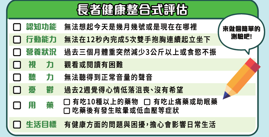 維護家中長者身體健康,不只是關心慢性疾病控制的情形,更需要留意身體與心理功能!國民健康署參考國際文獻,將抗老最核心的八個面向「認知功能、行動能力、營養、聽力、視力、憂鬱情形、用藥及生活目標」,整合為一套簡要的評估工具-長者健康整合式評估,5月起由參與試辦之院所提供服務,對象為有慢性疾病之65-74歲民眾(原住民提早至55歲),及75歲以上民眾。國民健康署呼籲,長者早期衡量身體與心理功能,及早介入醫療與社區資源的幫助,就能提升抗老力,高齡生活健康更美滿。 老化導致功能逐漸衰退 慢性疾病增加失能風險 依據國發會資料,我國65歲以上人口目前約380萬人,約占總人口比率16%,為「高齡社會」,衛生福利部106年老人狀況調查報告,長者衰弱情形隨年齡增加而上升,尤以75-79歲功能衰退最為明顯。另依據106年國民健康訪問調查報告,65歲以上年長者,超過8成的人至少患有1種慢性病,而同時患有2種慢性病的比率超過6成,且慢性疾病會增加功能衰退與失能風險。 (資料來源/衛福部國民健康署)