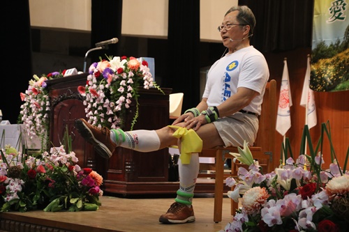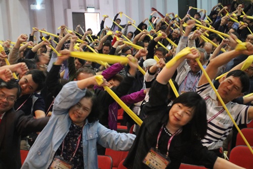 總幹事林芳仲牧師分享高齡關懷長照2.0異象 高齡關懷長照2.0地方教會事工介紹 為了讓所有議員對老人事工有深刻體驗,在四天會議中,大會特別邀請曾任拔河運動國家代表隊總教練、松年大學體適能講師蔡三雄牧師帶領所有議員,人手一條黃色彈力帶,在各時段進行肌力訓練。將來教會牧長同工可以幫助長者運用彈力帶等簡單運動器材,隨時鍛鍊增加肌力,社區的老人也可以透過教會設置的老人關懷據點,營造健康、自主,並有尊嚴的老年生活!